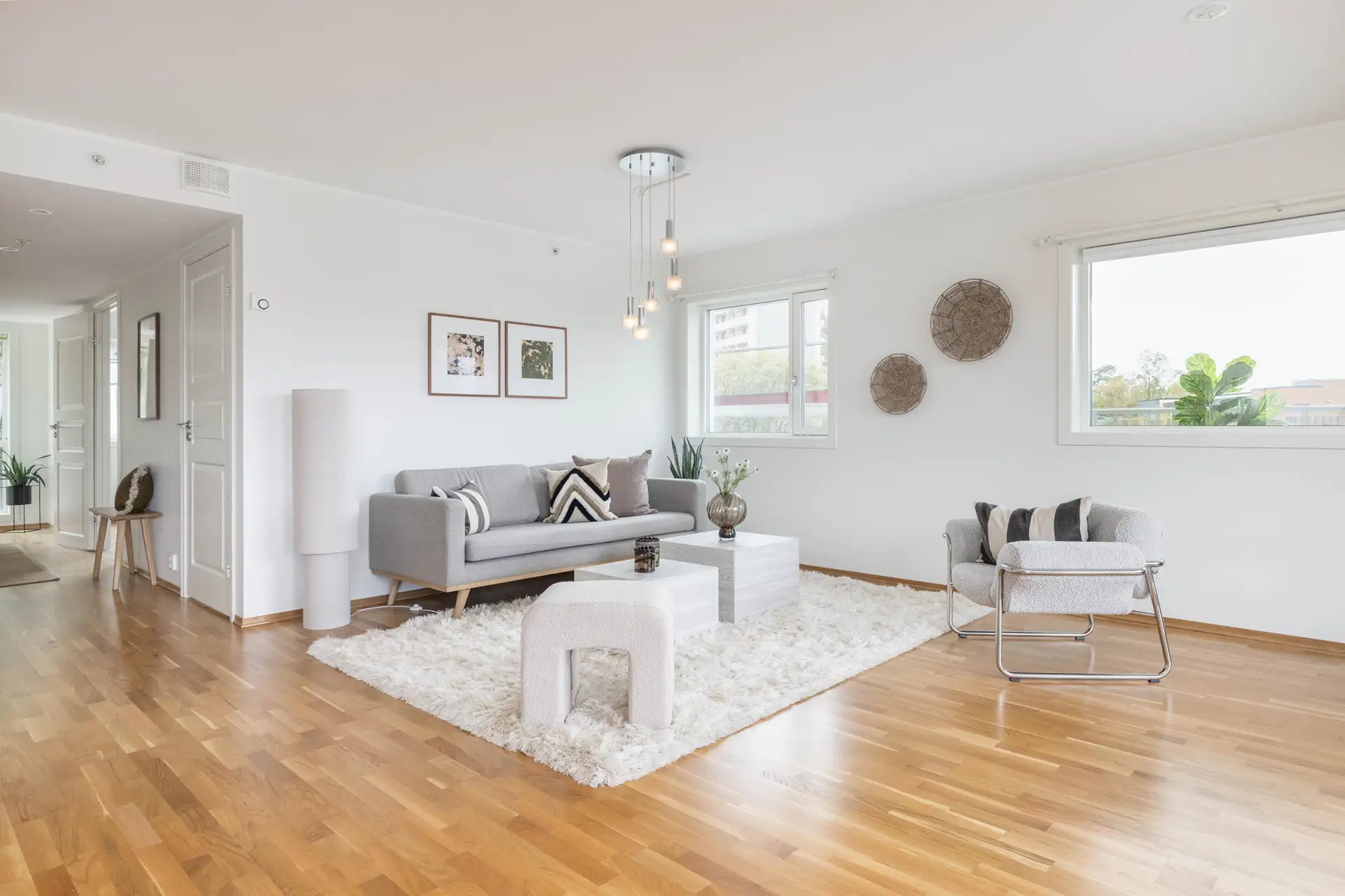 på gulv etter tepper og lignende må påregnes i brukt bolig. Det ble ikke flyttet på tyngre møbler eller