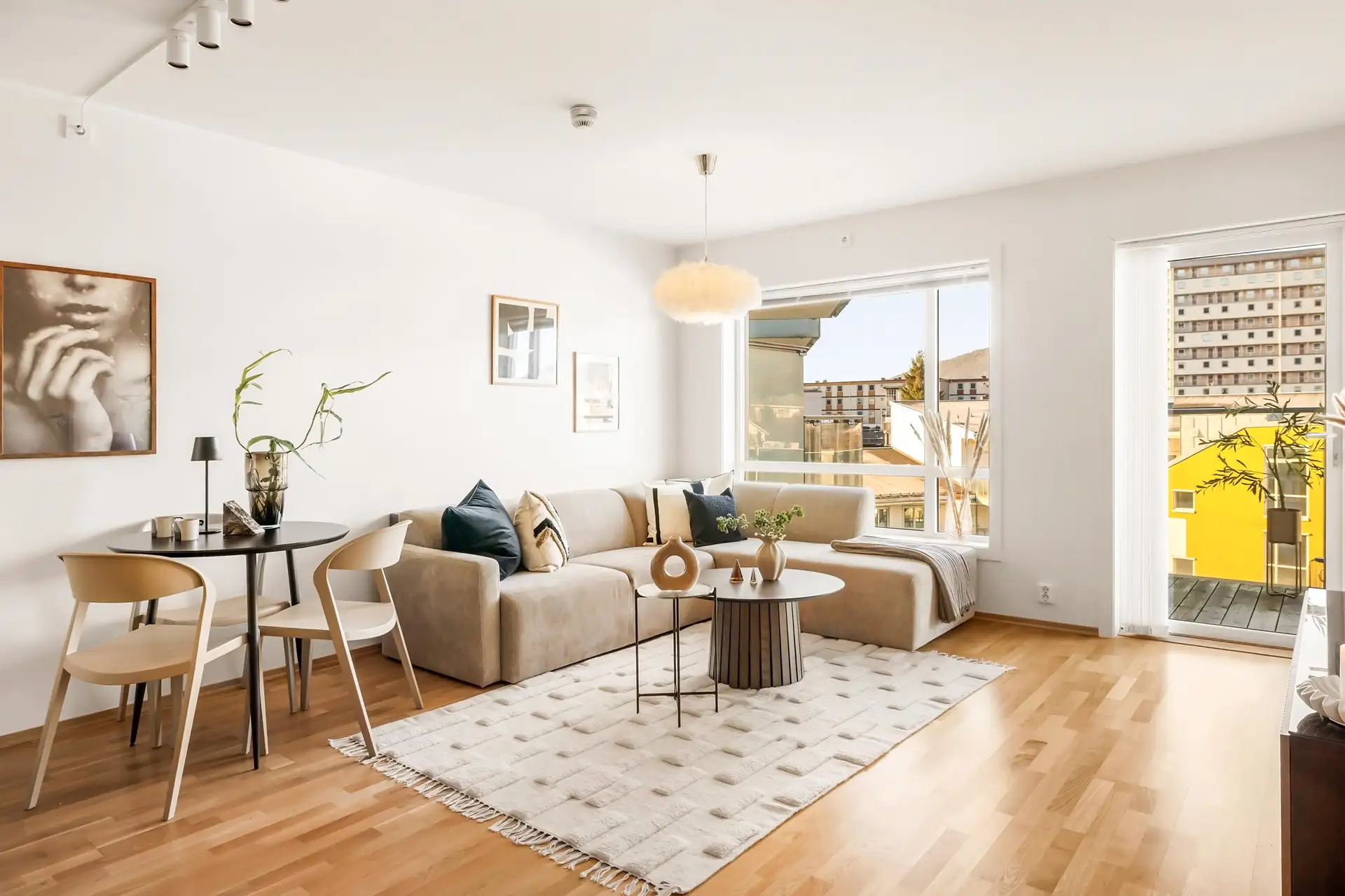 Dører: Slett entrédør med lydklasse dB43. Porttelefon (via app). Sidehengslet balkongdør med 3-lags