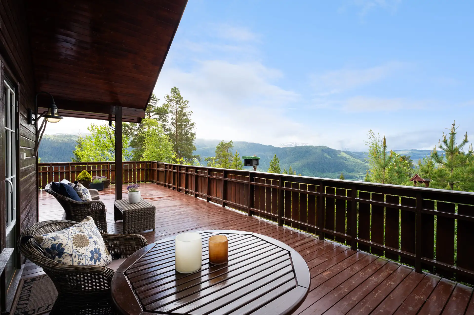 Luftealtan i front med utgang frå stue, terrasse i front/gavl med utgang frå stue og tilkomst frå terreng. Murt peis i front.