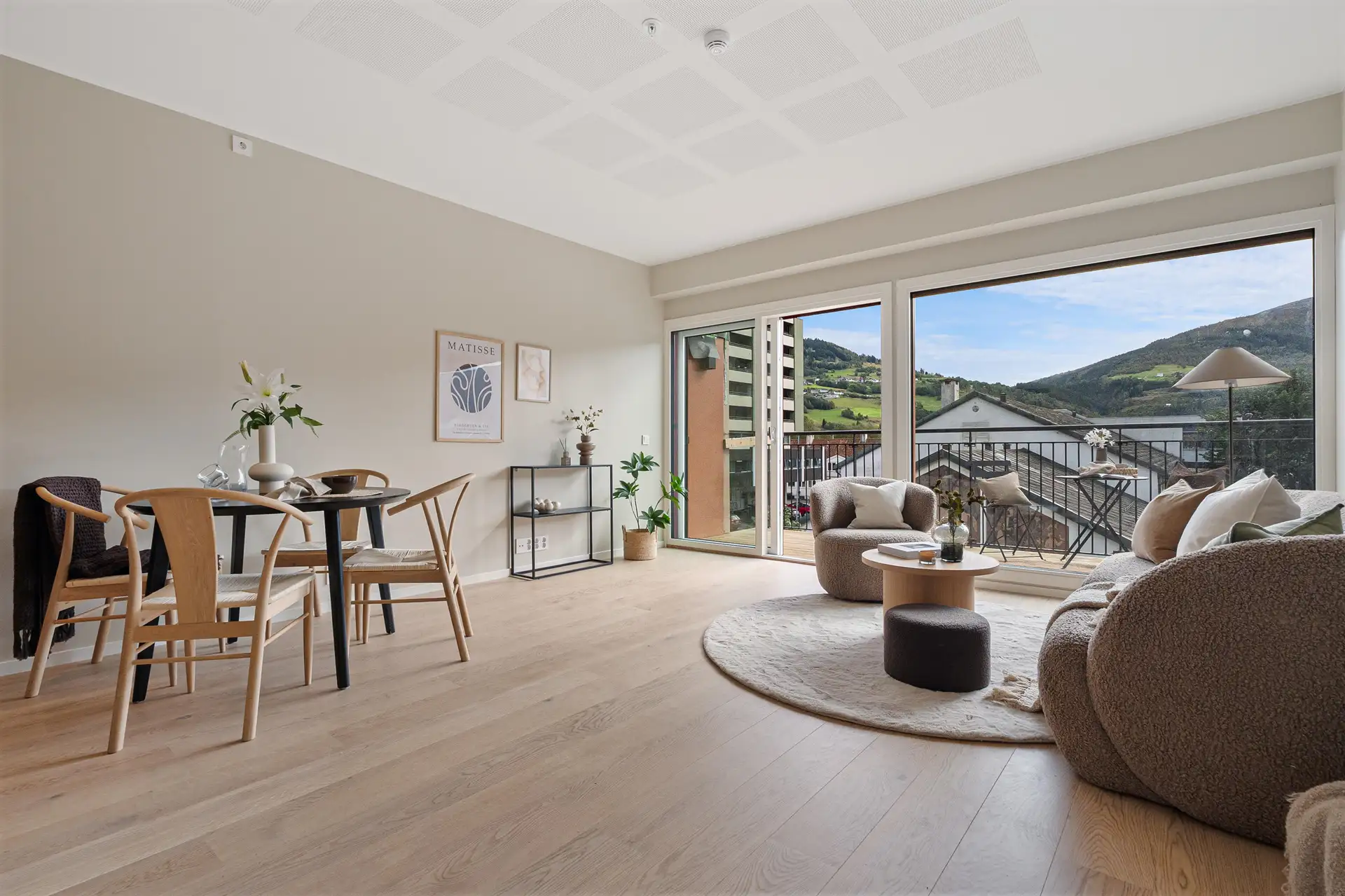 Her er plass til å møblere med sofa/sittegruppe, mediebenk og spiseplass mot kjøkkenet. Kjøkkenet er