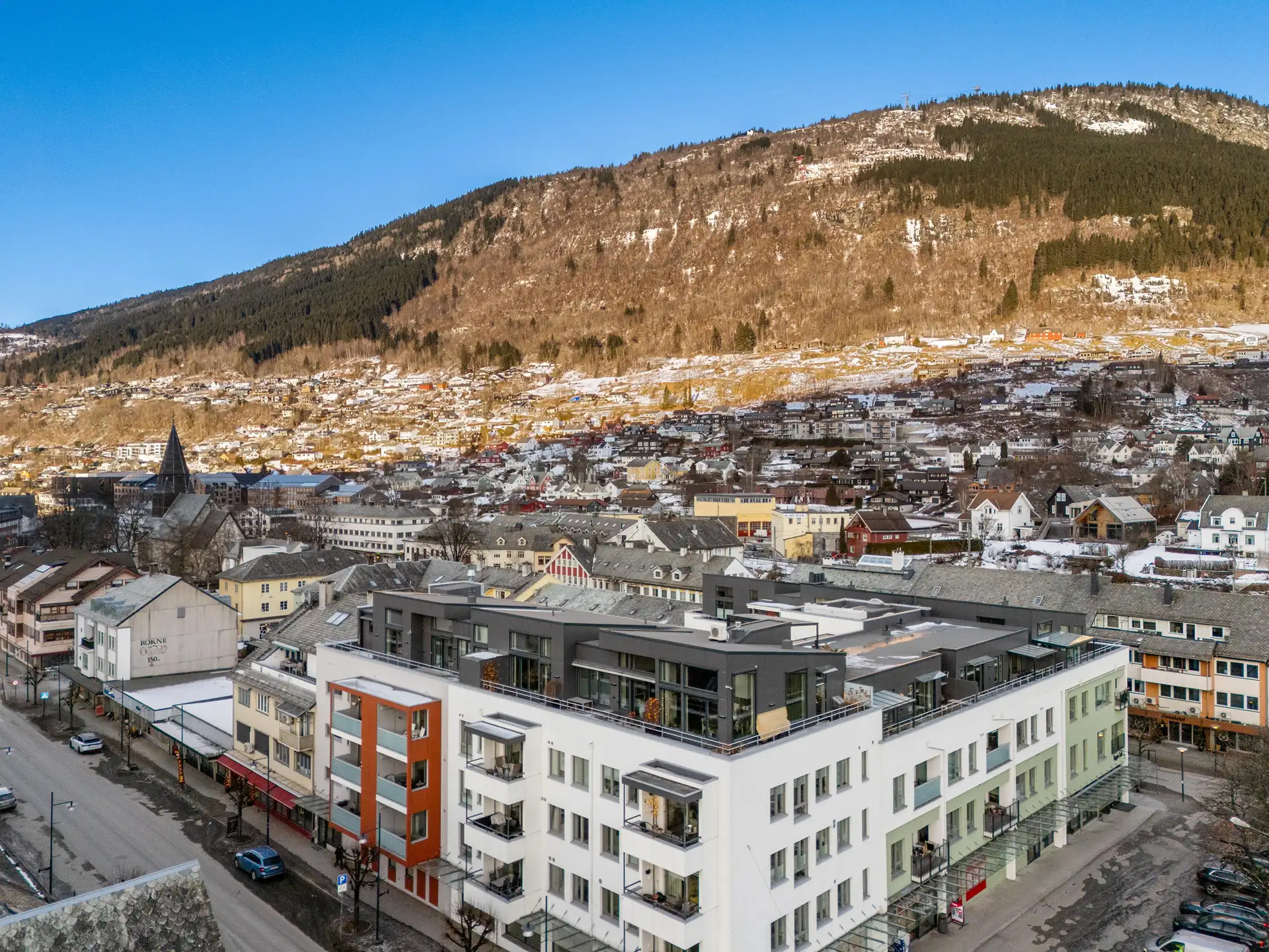 skyvedør inn mot allrom med stue og kjøkken, samt to soverom og balkong. Ved inngangspartiet er det en