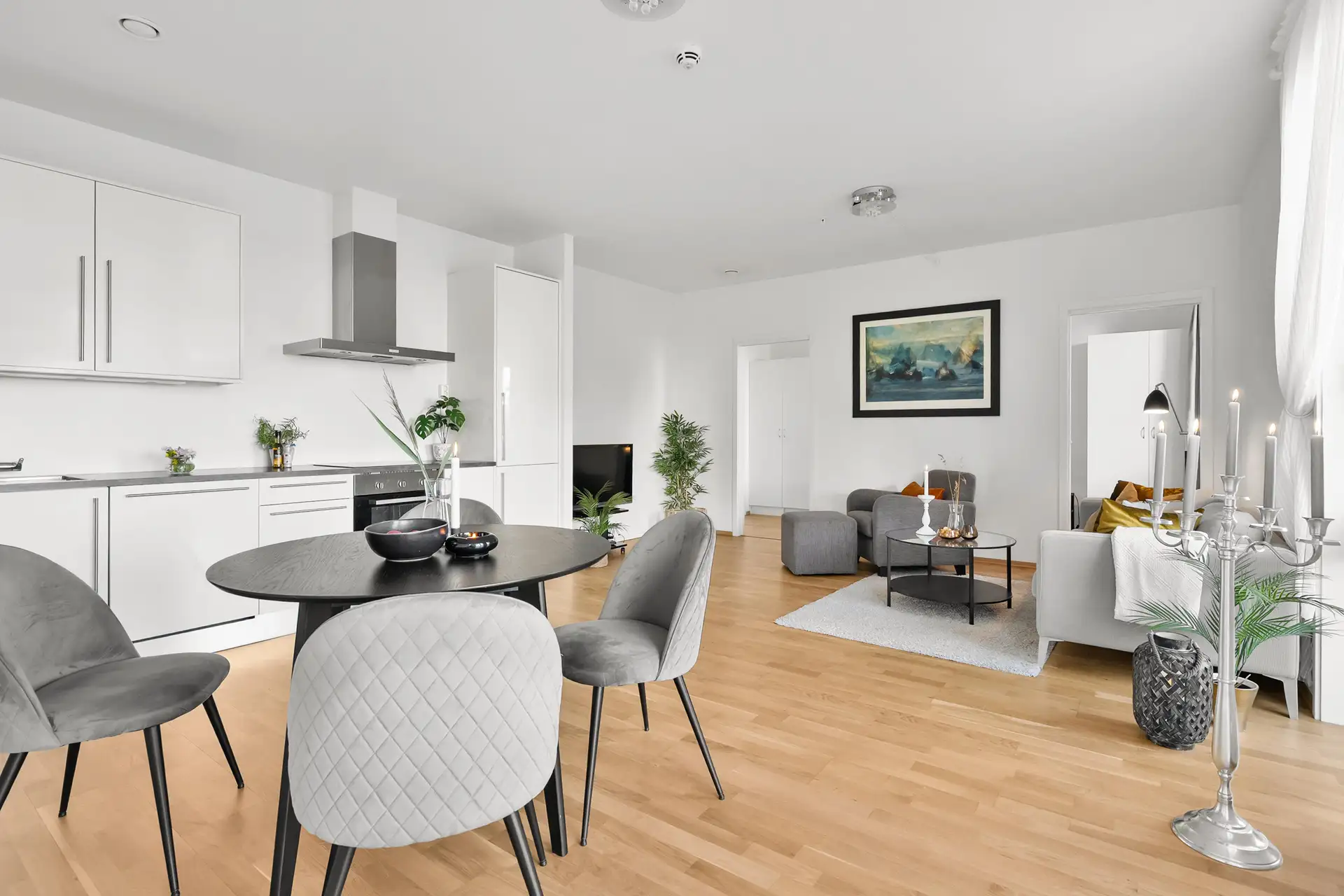 I leiligheten ligger et åpent allrom med stue og kjøkken. Rommet har parkett på gulvet, lysmalte vegger og