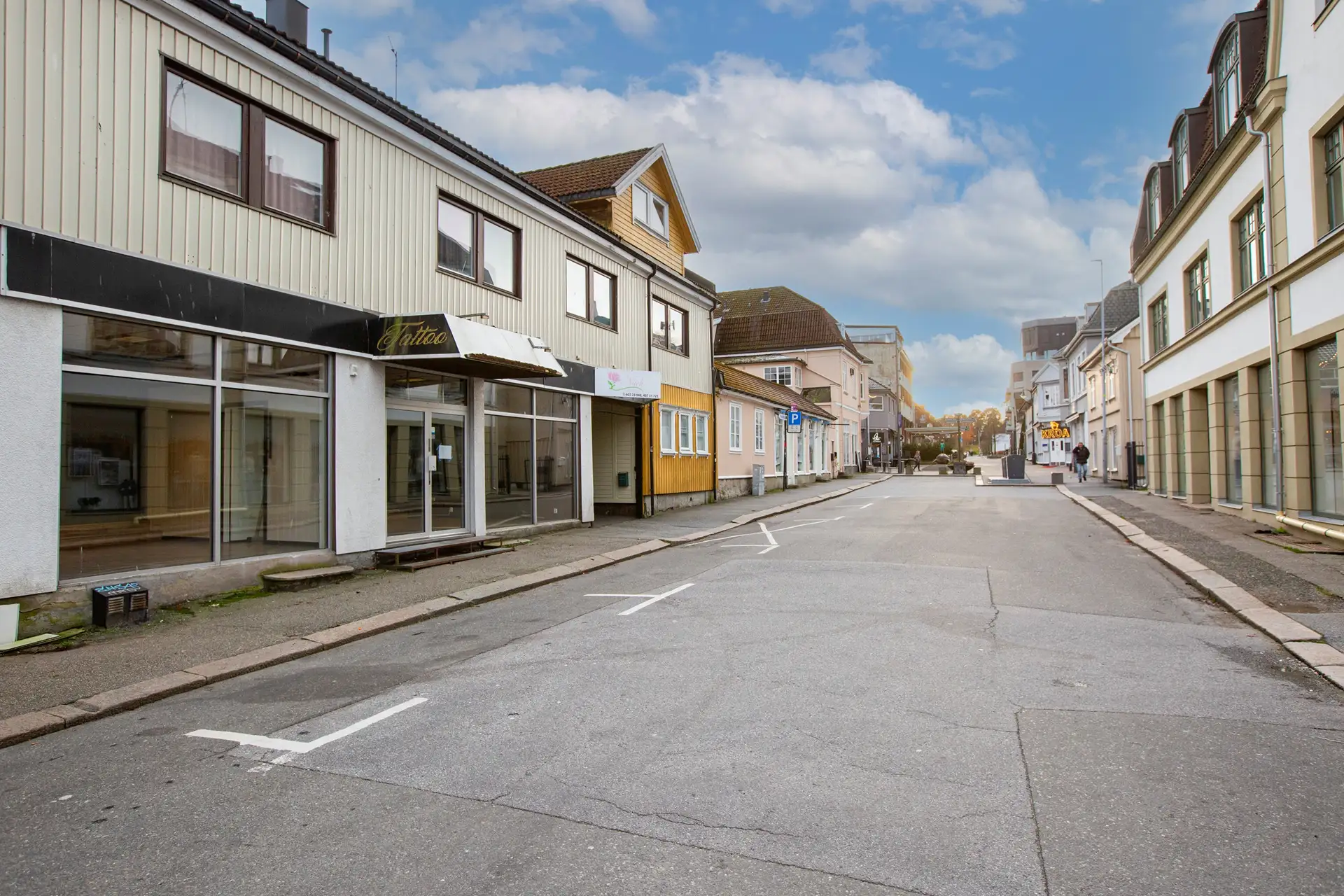 Rett ned for byens gågate og nabo lokale til den populære Indiske restauranten i gågata, med samme gårdeier forøvrig. 2 store utstillingsvinduer og meget synlig skilting på fasaden både fra gågata og Pellygata, samt front mot Jernbanegata. Bygget skal males utvendig, så det blir lik farge med denne nabo eiendommen opp til gågata, til våren. Hvis ikke ny leietager vil ha sin farge på bygget da!