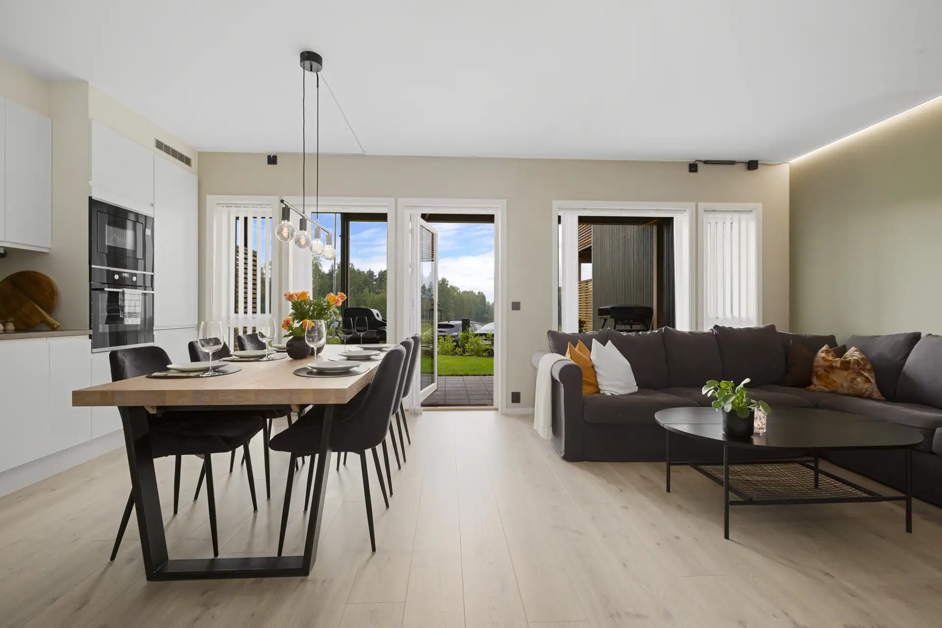 Leiligheten åpner seg virkelig opp når vi kommer til stue og kjøkkenløsningen. Fin romfølelse, gode