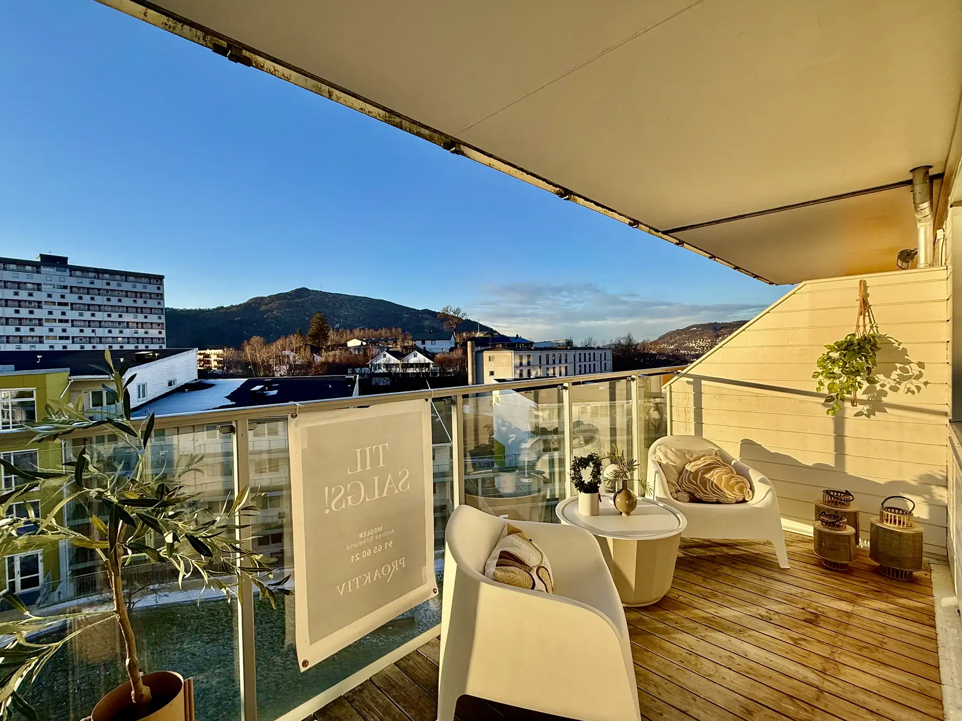 Balkonger, terrasser og rom under balkonger: Vestvendt, overbygget balkong på 8,8 m² med utgang fra stue/kjøkken. Balkongen er oppført i betongkonstruksjoner med glassrekkverk. Utstyrt med utvendig jordet stikkontakt. Rekkverkshøyde ble målt til 1,22 meter. Til informasjon: Ihht. avhendingslovens paragraf 2-13 skal rekkverkshøyde og åpninger undersøkes mot gjeldende byggteknisk forskrift på befaringstidspunktet.