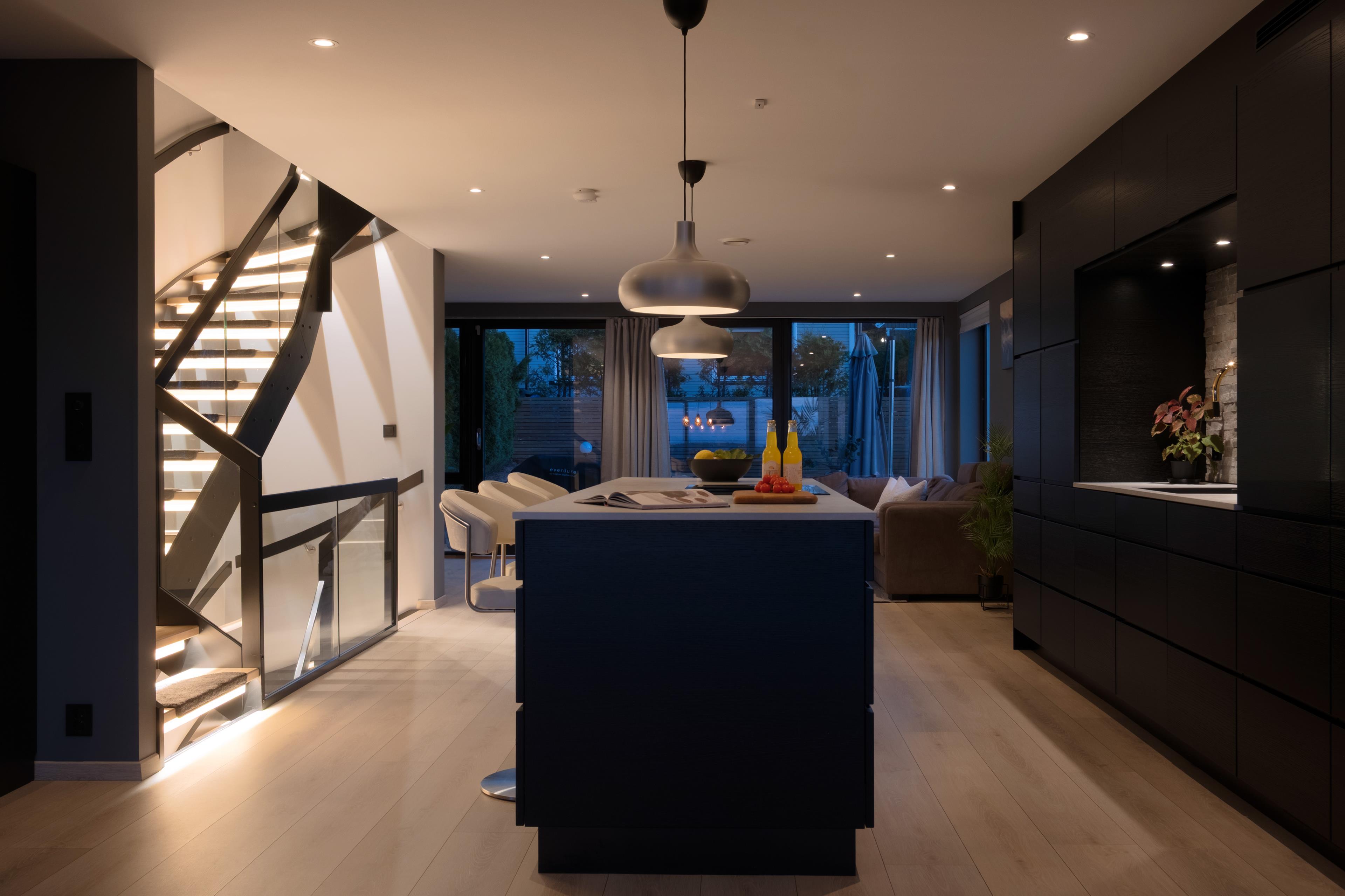 Boligen har malt tretrapp med glassrekkverk.