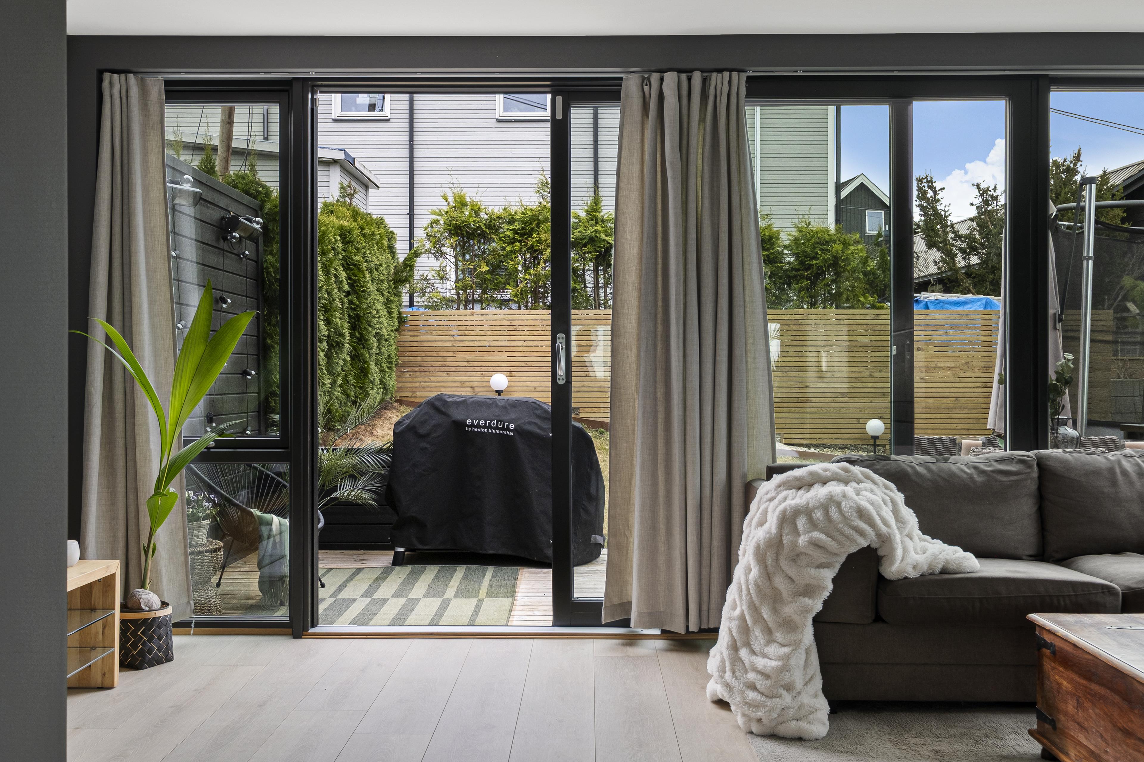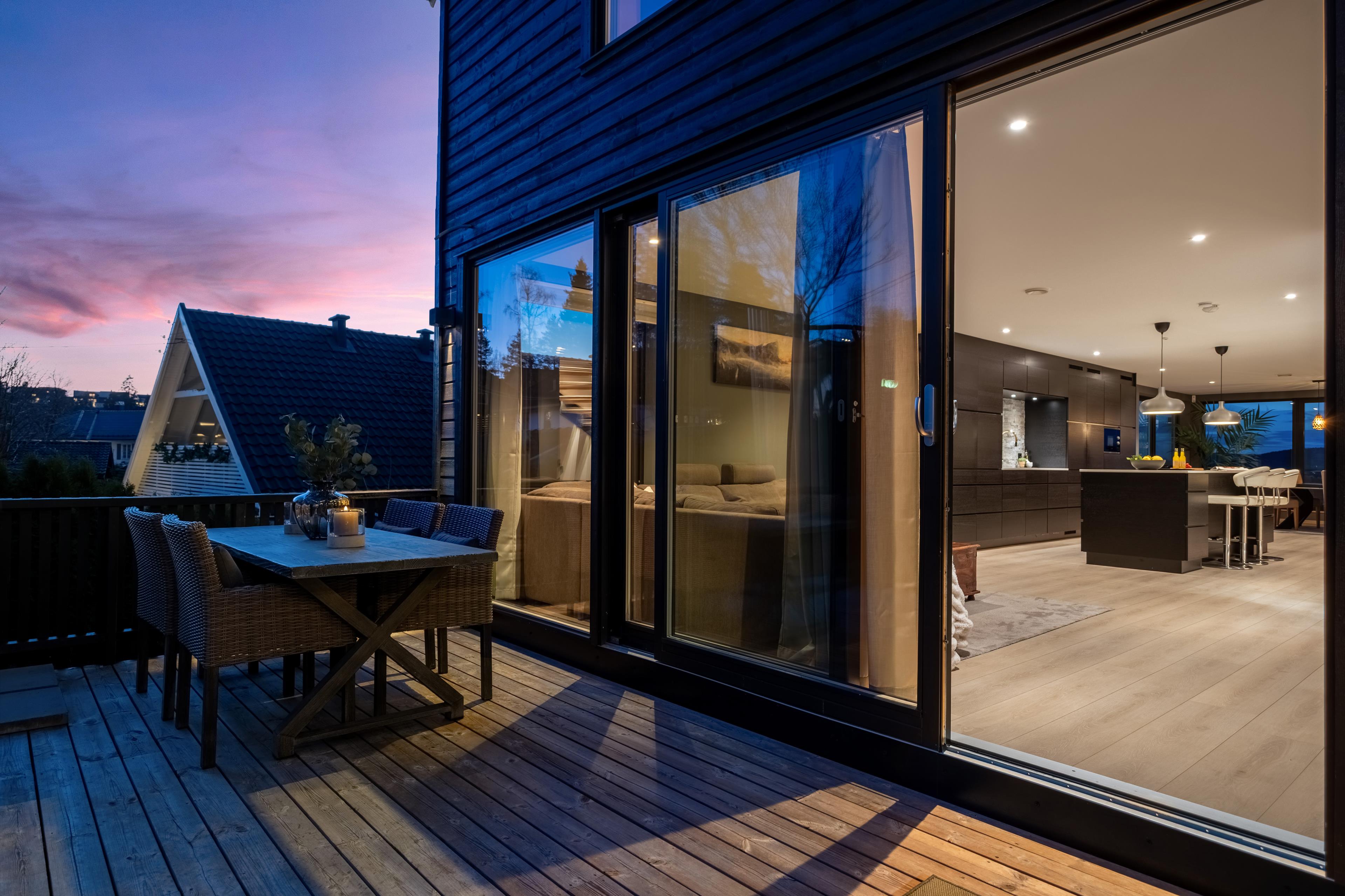 og det er skyvebalkongdører i malt tre. Innvendig har boligen malte fyllingsdører.