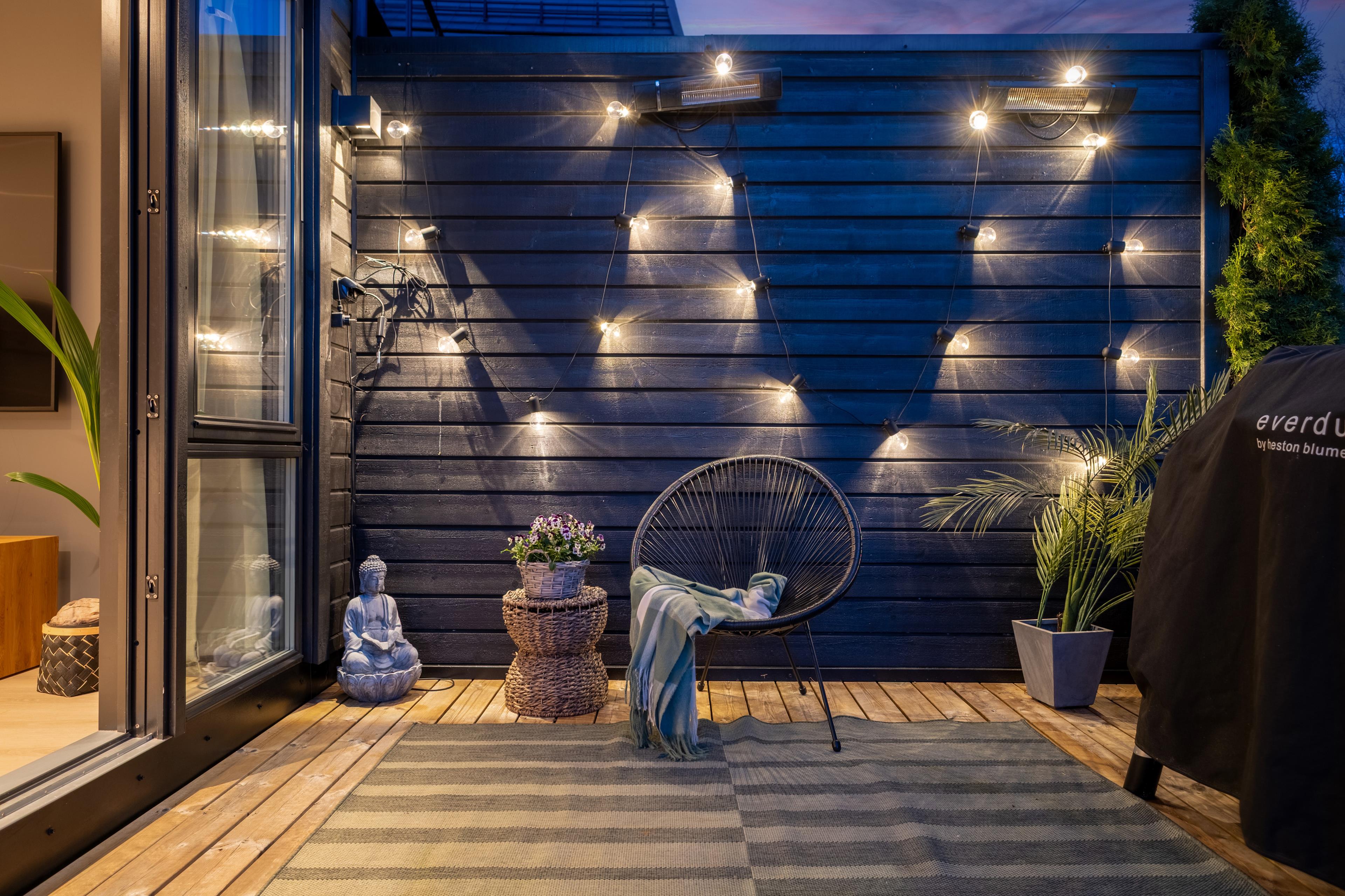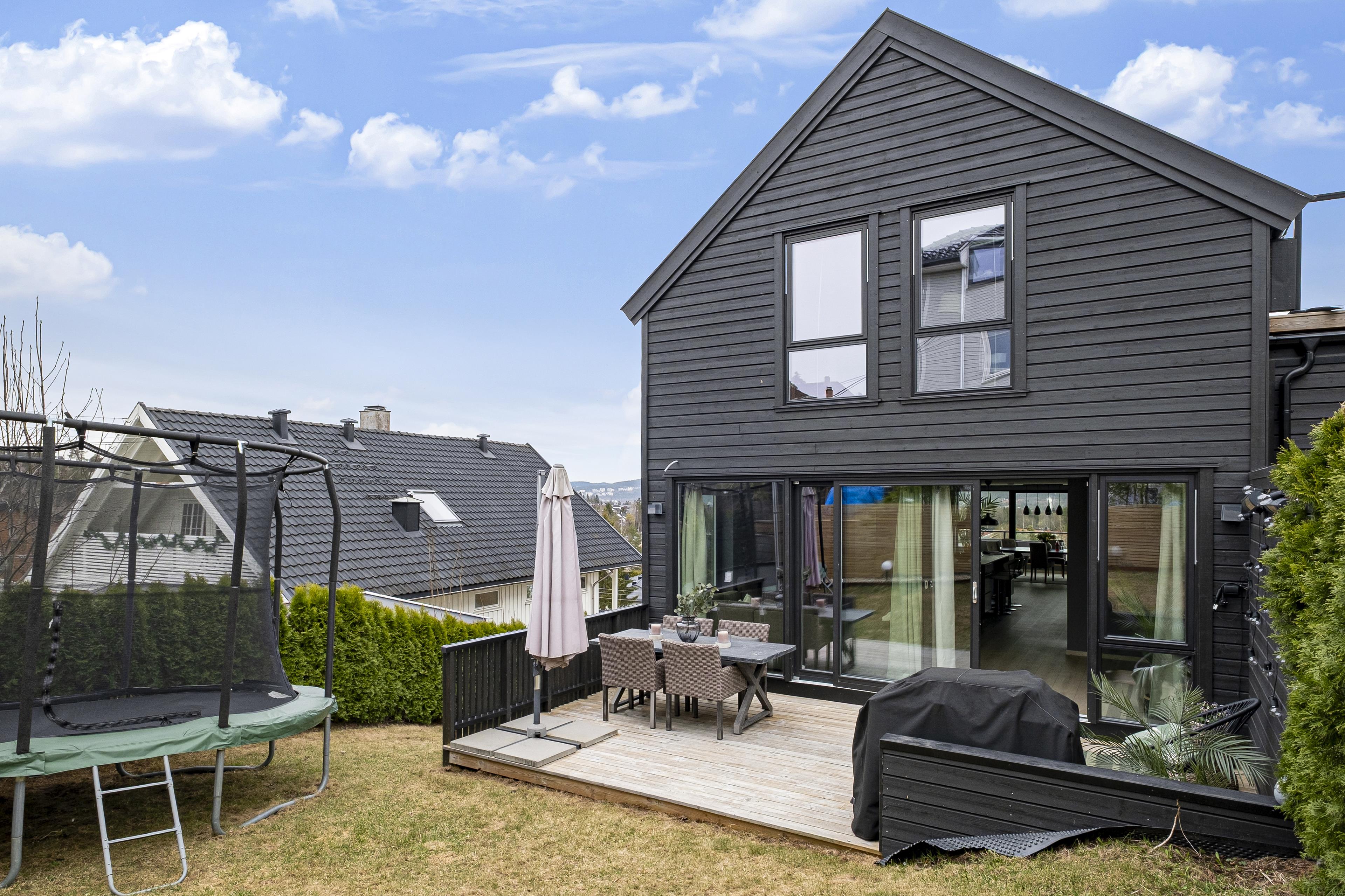 Det er to uteplasser. Fra stue og hage er det adkomst til en terrasseplatting i trevirke antatt lagt direkte på